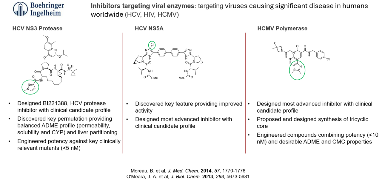 I was fortunate to work within strong multidisciplinary teams to contribute to building platforms and to the identification of several development candidates in multiple therapeutic areas (virology, oncology, rare genetic disease, CNS). I was directly involved with the discovery of development candidates for HCV protease, HCV NS5A, HCMV polymerase, next-generation platinum, SSTR2-targeting conjugate, MYB splicing modulator and HTT splicing modulator.
